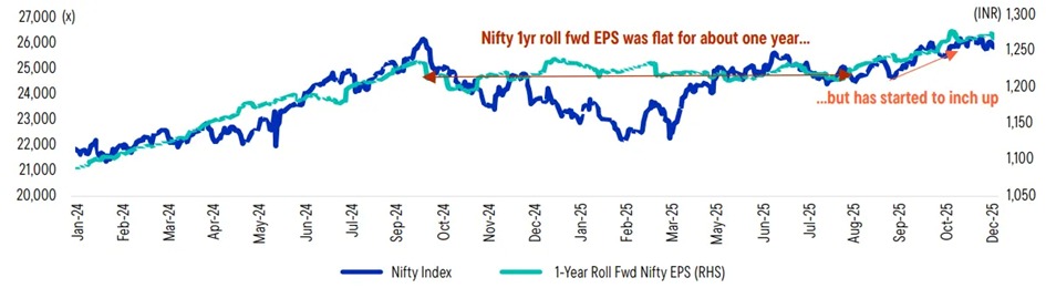 Das Jahr 2025 war geprägt von beispiellosen globalen Handelsstörungen und geopolitischen Gegenwinden. In diesem Umfeld wurden die Gewinnprognosen für Indien im Laufe des Jahres 2025 mehrfach nach unten korrigiert. Aktuelle Prognosen gehen davon aus, dass das Wachstum des Gewinns je Aktie (EPS) in Indien für das Geschäftsjahr 2026 (GJ26, endet im März 2026) bei etwa 10 % liegen wird, was einen Rückgang gegenüber den 12 % des Vorjahres bedeutet.