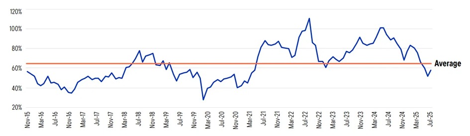 MSCI India One-Year Forward P/E Premium vs. MSCI Emerging Markets